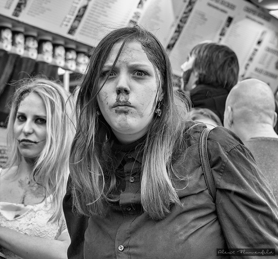 Pendant cette procession de morts-vivants, les participants n’étaient pas seulement maquillés mais ils incarnaient réellement leur personnage de zombie. L’attitude, la démarche, le regard, tout y était. Face aux photographes (dont moi-même), ils les fixaient du regard, levaient les bras, tordaient la bouche, gémissaient, essayaient de les attraper… Une bonne ambiance donc. J’ai adoré.